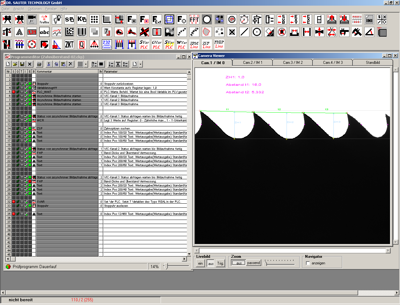 SAC-Professional Entwicklungssystem, mit 3 Kameras. Die letzten 7 Buttons sind user-definierte Befehle, die speziell zur Bandvermessung und Synchronsisation mit dem Beckhoff-System von mir entwickelt wurden. |